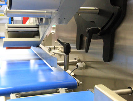 - Les réglages vertical, angulaire et latéral de l’étiqueteuse supérieure sont réalisés avec des manivelles dotées de compte tours.